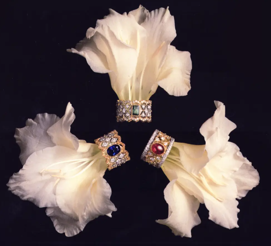 At Buccellati, handcrafting is amazingly fascinating. There is something authentic and even noble in “creating” objects. Band Rings are witnesses of a philosophy underlining the huge value of workmanship and make it immediately recognizable: every piercing is executed scrupulously, the proportions between full and empty spaces are essential, the engraving gives softness to the metal and the central stones animate a precious and unique workmanship. Buccellati dares the contrast, shouts uniqueness, imposes colours and leaves us speechless, amazed.